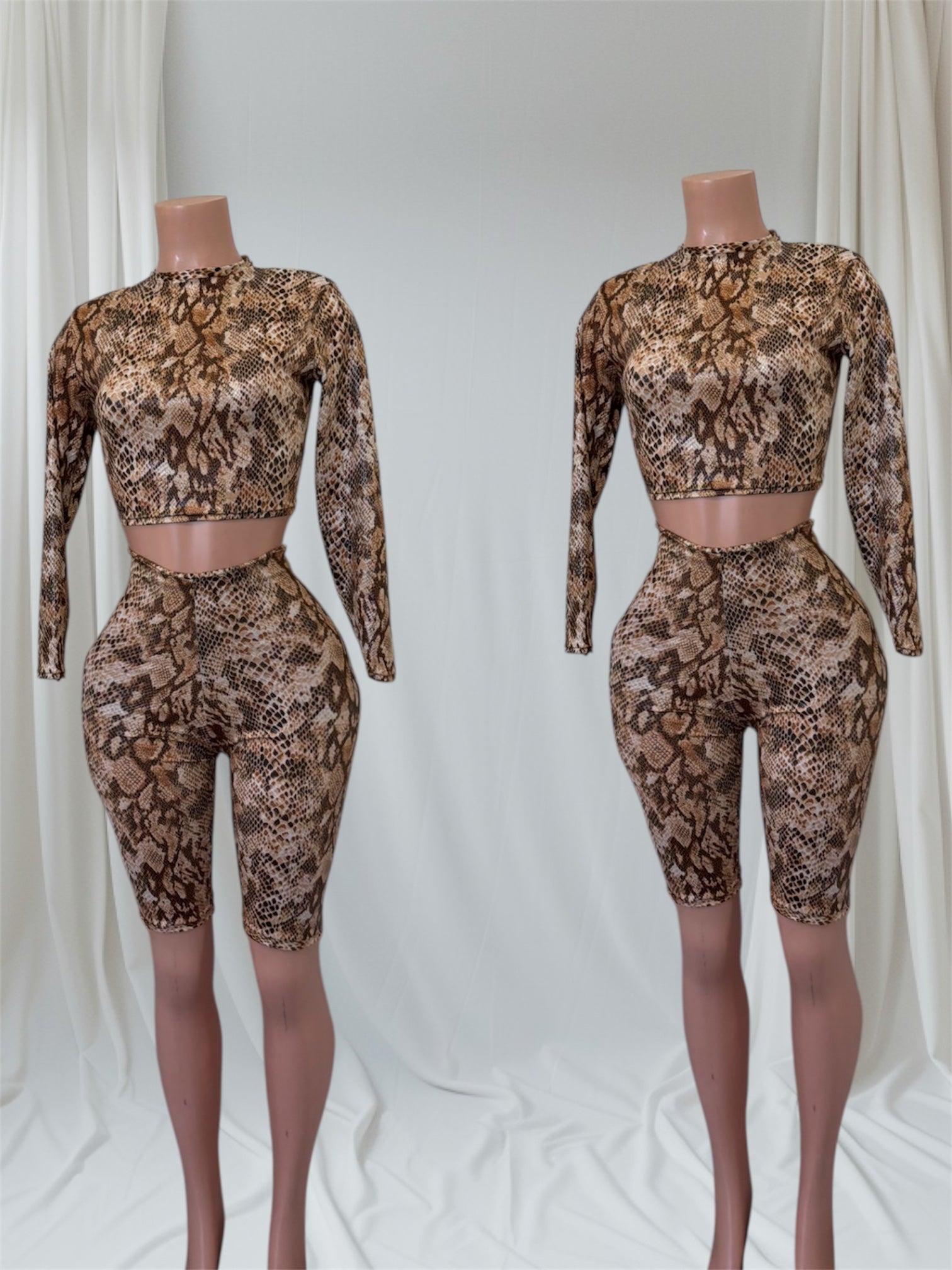 Turn the heat all the way up in the Desire Set. This bold snakeskin two-piece features a fitted long-sleeve crop top paired with curve-hugging biker shorts that sculpt and snatch effortlessly. Designed with a sleek, stretchy fabric that moves with your body, this set delivers confident, head-turning energy from every angle. Whether you’re stepping out or styling it for a moment, Desire is made to dominate.