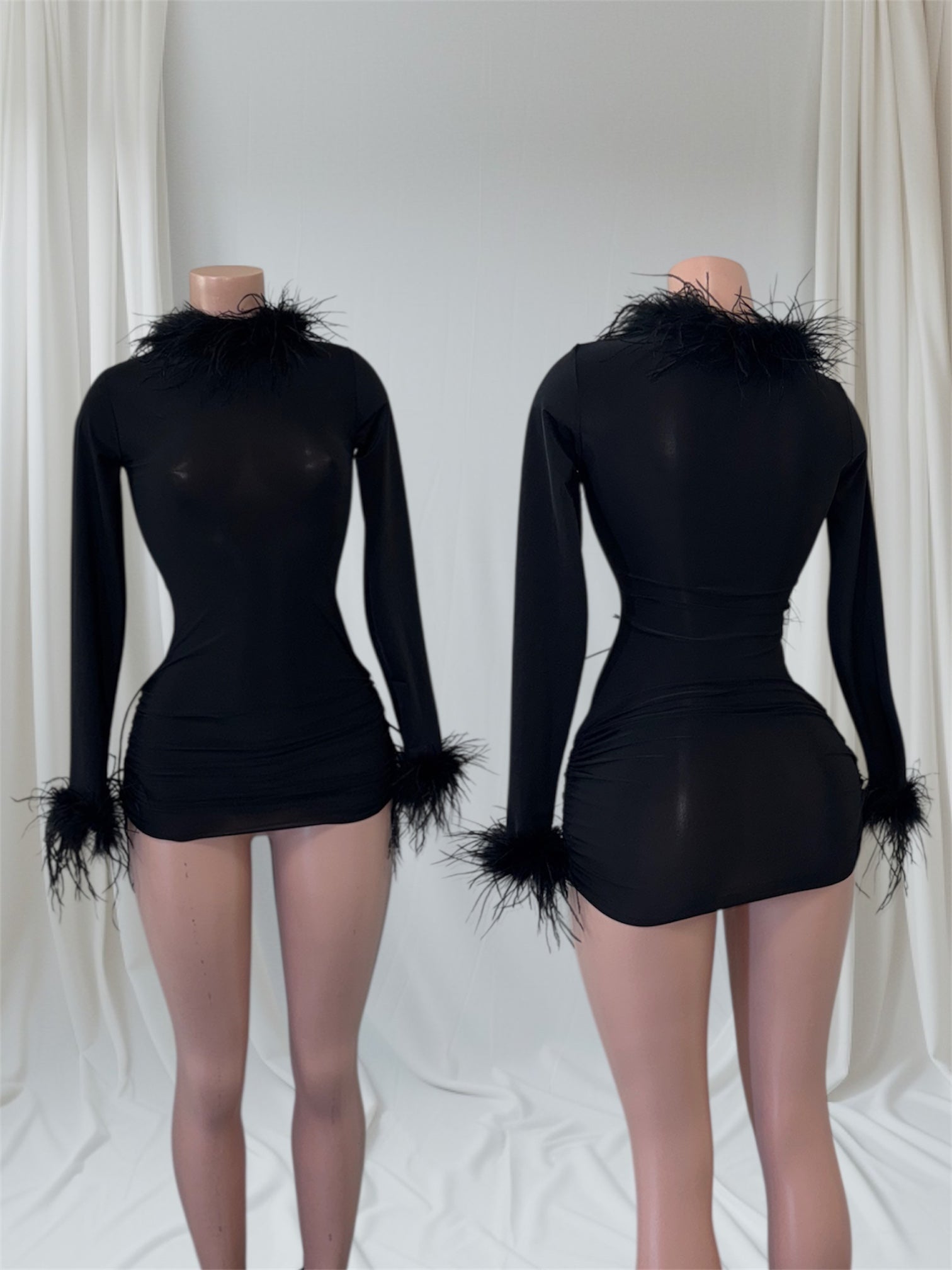 Command attention in our Midnight Luxe Dress where elegance meets seduction. Crafted from premium stretch fabric for a flawless silhouette and topped with lavish ostrich feather detailing around the neck and wrist, this piece brings pure sophistication with a daring edge. Perfect for upscale events, birthdays, or nights out when you want to make a lasting impression.