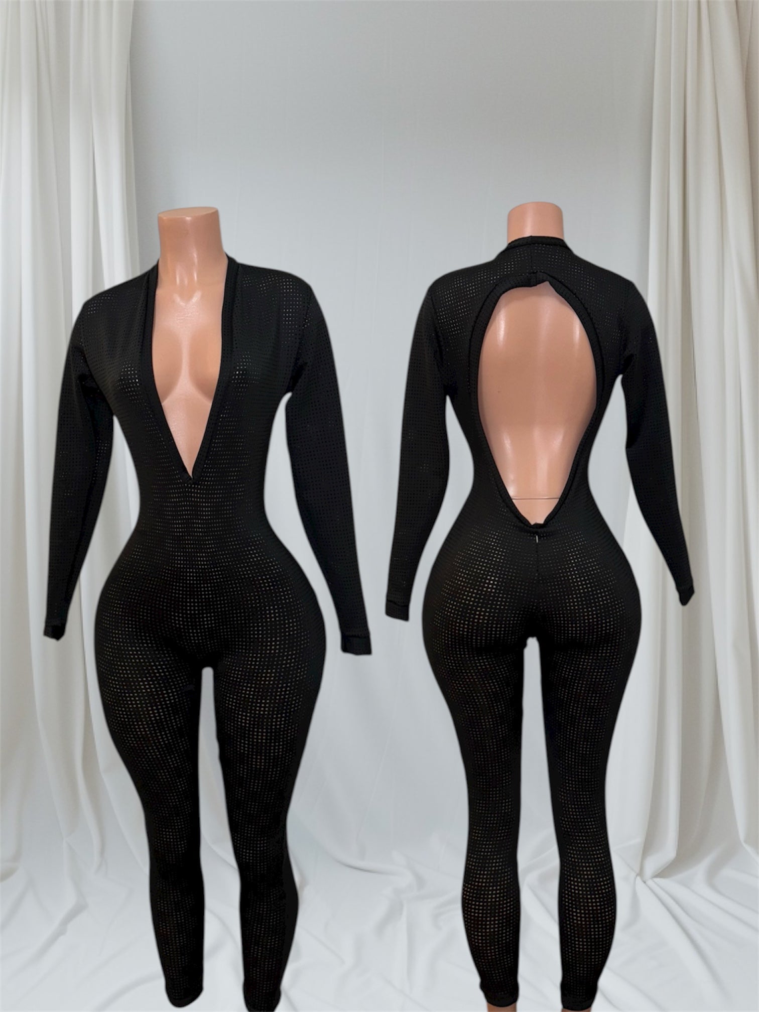 Crafted from premium stretch-mesh, this romper smooths your shape while keeping you breathable and comfortable. The dramatic v cut and open-back design give a daring finish that instantly elevates your curves.