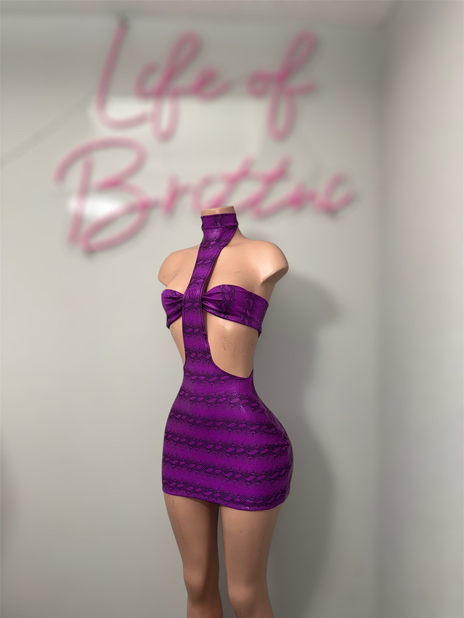 The Venom Vixen Mini is your go-to showstopper for nights that demand attention. Crafted in a rich purple snakeskin stretch fabric, this bold mini features a sculpted fit, fierce cutouts, and a halter neckline that commands the room.