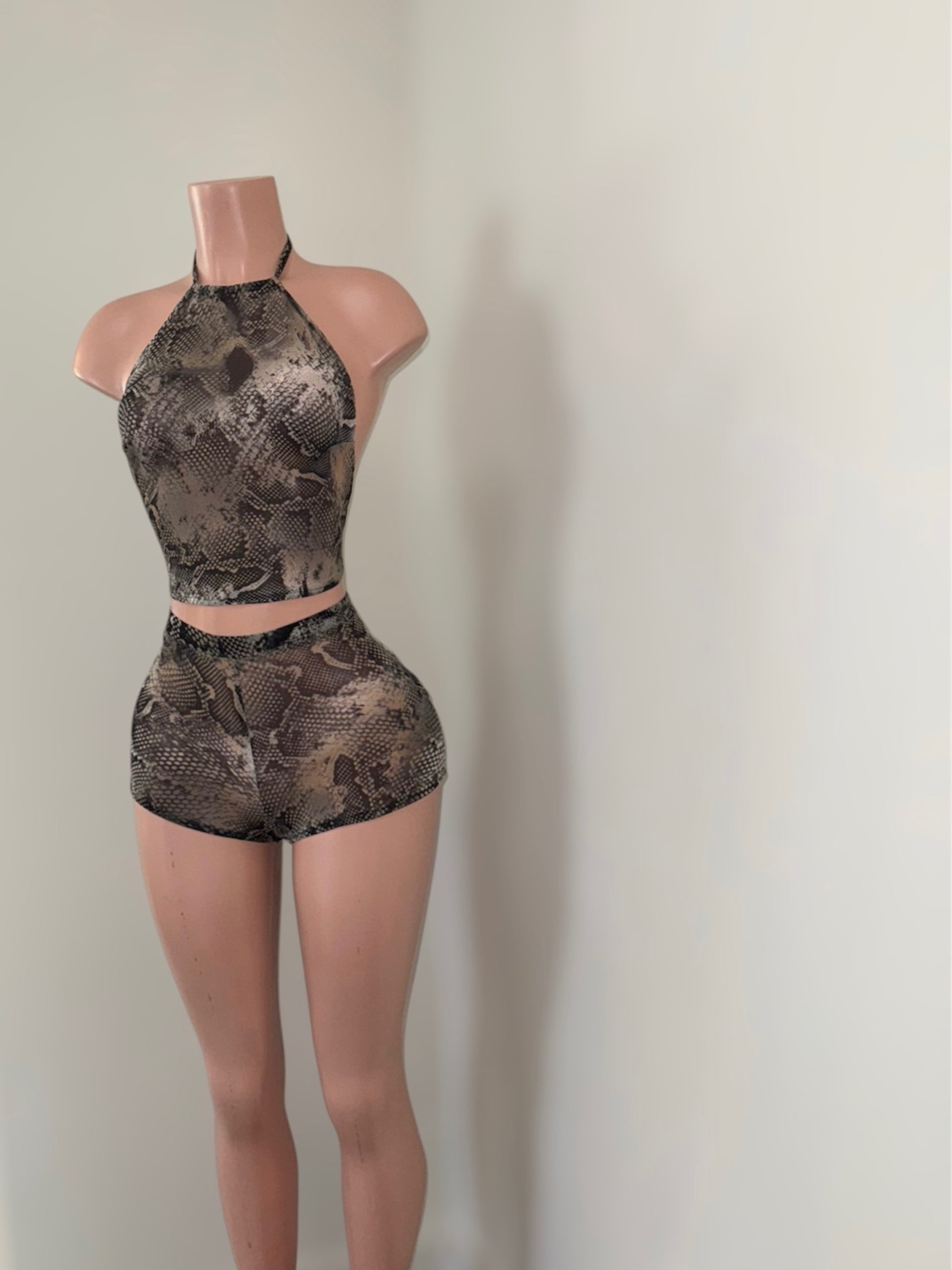 Turn heads in the Wild Eclipse 3.0 where edgy meets luxe. This two-piece features a halter top paired with sheer croc-print mesh shorts that hug every curve. Designed with a smooth, ultra-stretch fabric for a sleek, comfortable fit, this set is perfect for a night out, concerts, or bold photo shoots.